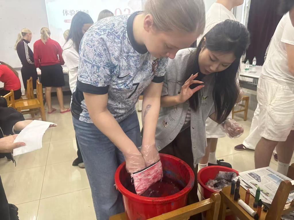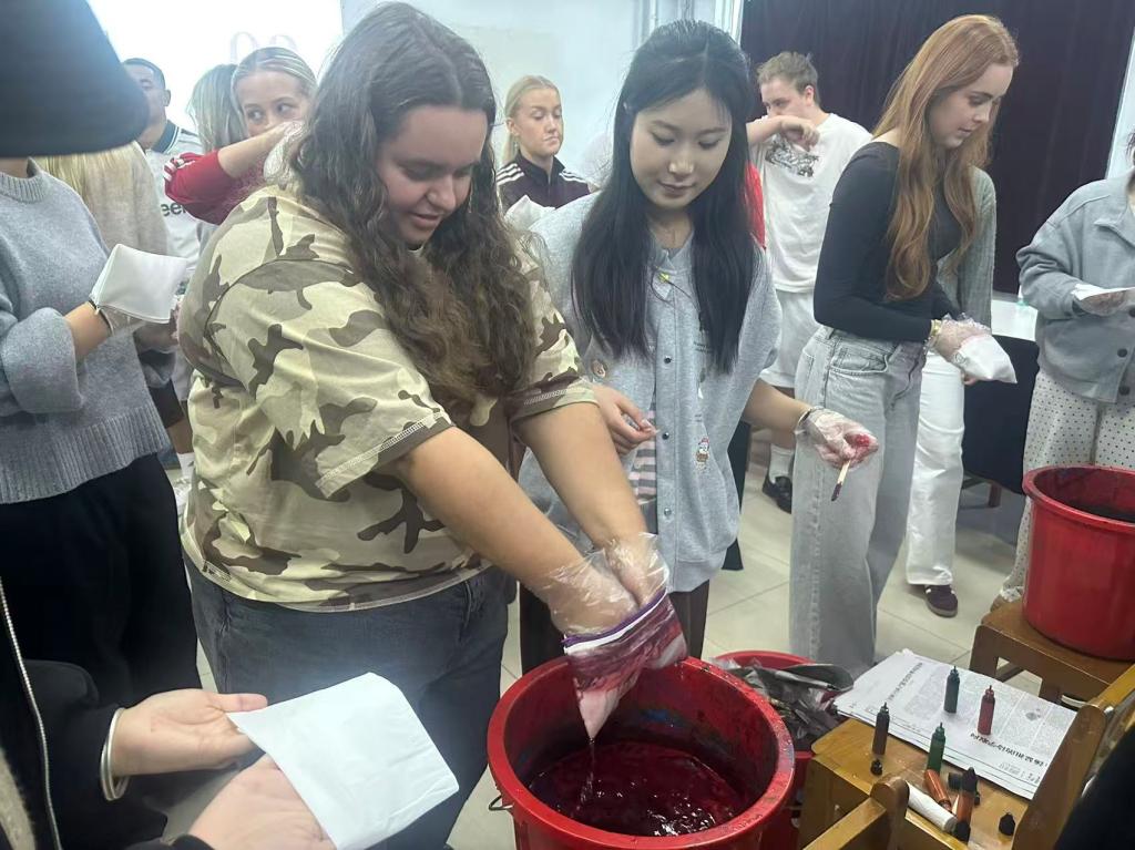 在随后的“漂漆”工艺体验环节,“艺苑文创”团队成员耐心示范操作步骤:先在容器中倒入特制漆液,滴入不同颜色的漆料,待其在水面自然晕染形成斑斓纹路后,将白色文具袋慢慢浸入水中,让漆纹完整转印至袋面,最后经过晾干、固色等工序,一件独一无二的漂漆文具袋便初见雏形。北丹麦师生兴致勃勃地投入体验,在团队成员的指导下,尝试调整漆料的滴入顺序与用量,探索不同纹路的形成效果。过程中,大家不时交流创作想法,对漂漆工艺“随形赋彩、自然天成”的特点充满好奇,当看到自己亲手制作的文具袋逐渐呈现出灵动的纹理时,纷纷露出欣喜的笑容。