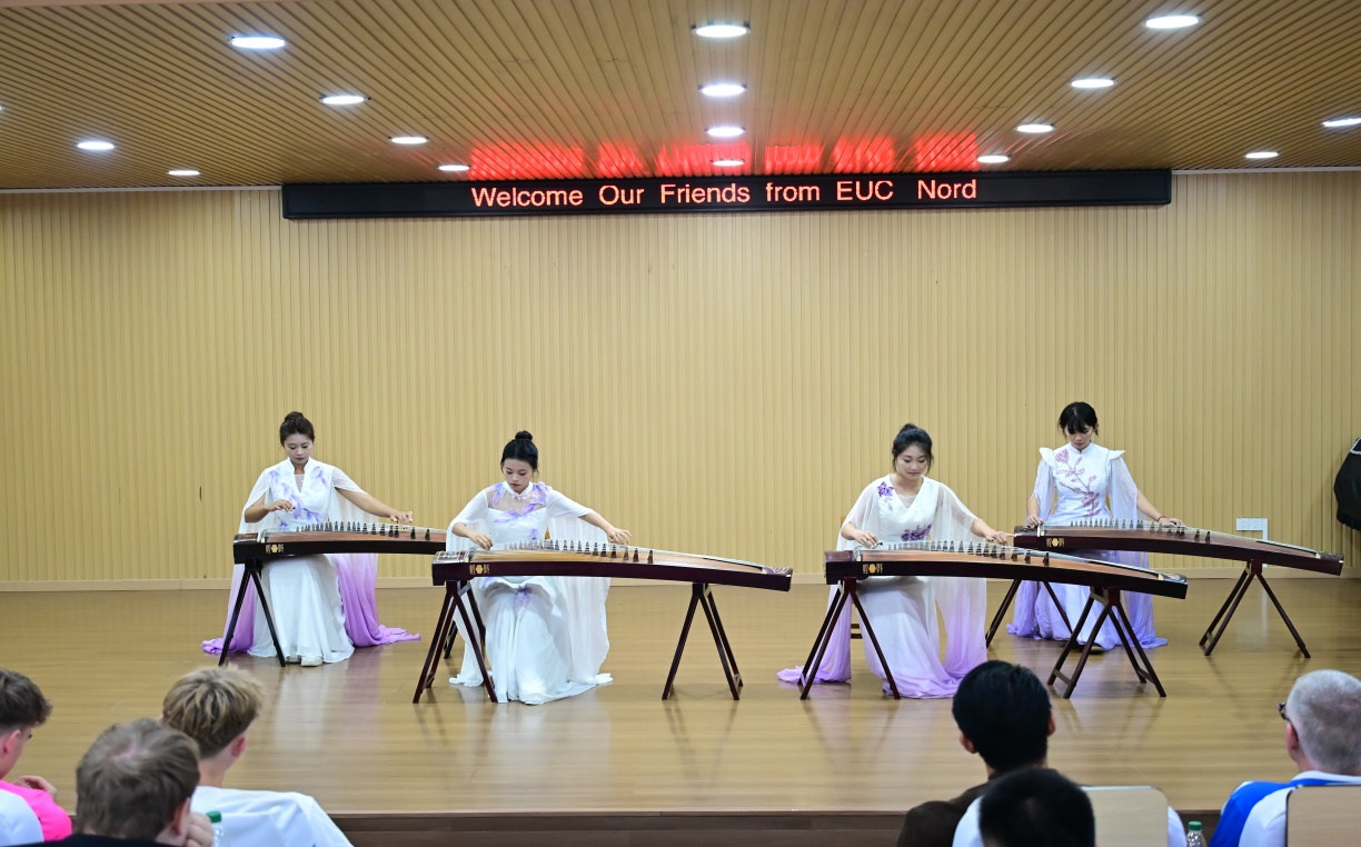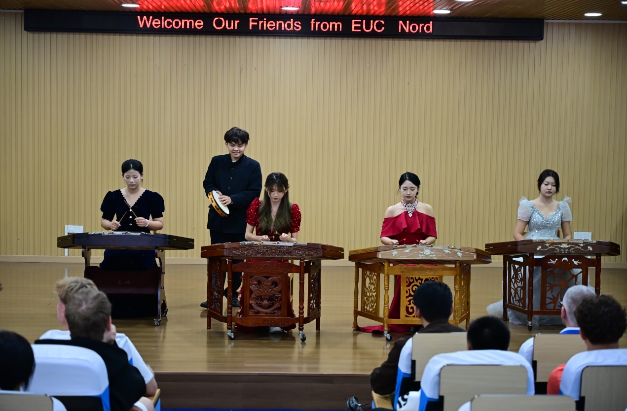 汇演在古筝重奏《春江花月夜》中拉开帷幕。河北科技师范学院艺术学院“翊・筝乐团”四位演奏者,以清丽婉转的古筝音色,将“春江潮水连海平,海上明月共潮生”的诗意画卷徐徐展开,从江楼钟声到渔舟远去,连贯的叙事性演绎让中丹师生共同沉醉于中国古典音乐的意境之中,充分展现了中国民族音乐的独特魅力。