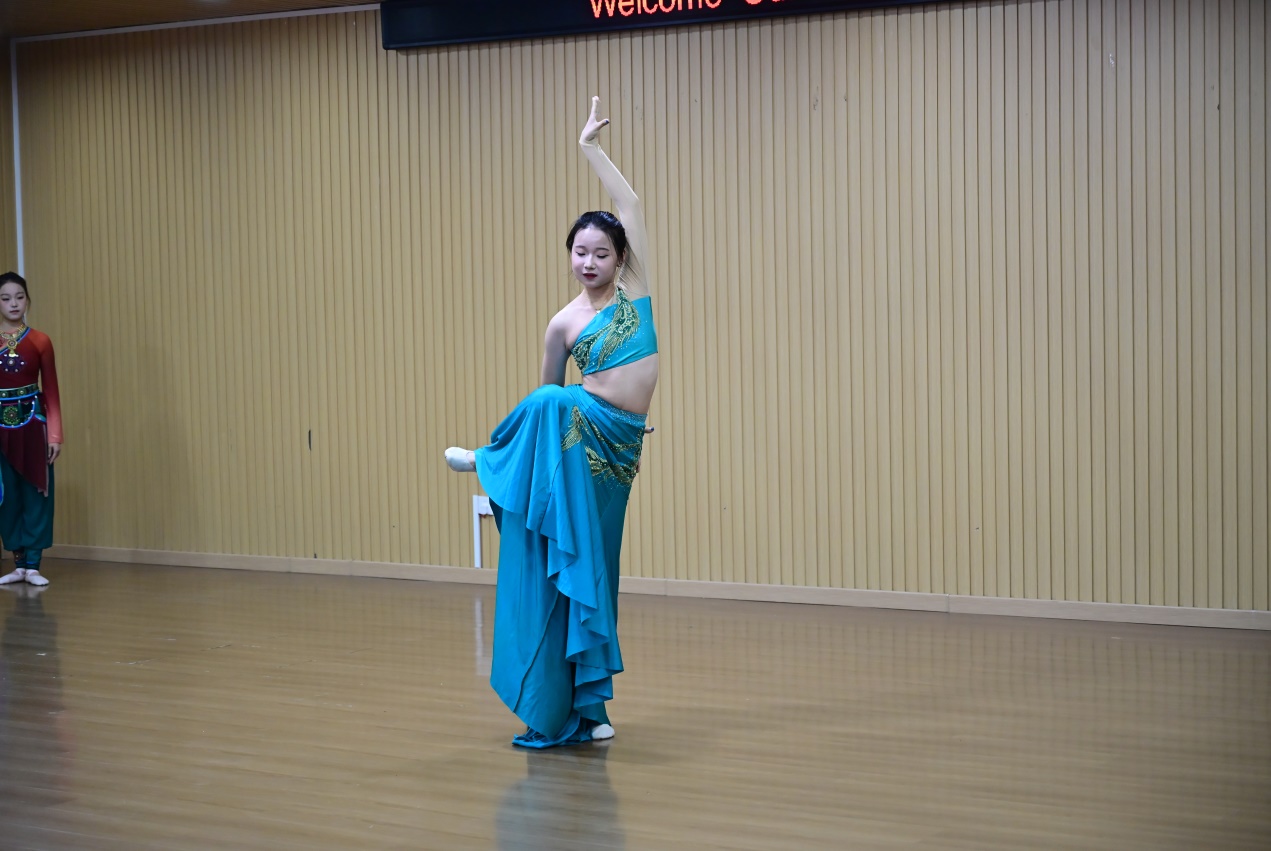 随后,多元艺术形式轮番登场,尽显文化风采。舞蹈串烧《舞绘风华》汇聚多民族与古典舞蹈元素,表演者用灵动舞姿,先后呈现蒙族的草原豪情、傣族的傣乡灵动、维族的西域风情,还再现了唐代拓枝舞的盛唐韵致与《春闺梦》的戏曲柔美,让现场观众直观感受中华舞蹈的丰富多元;声乐专业同学带来的女生二重唱《江畔独步寻花》,以杜甫诗作为蓝本,用悠扬歌声传递对自然美景的喜爱与对美好生活的向往,体现了古典诗词与现代音乐完美融合;扬琴协奏《玛依拉》,以轻盈明快的曲调,生动塑造出活泼可爱的哈萨克族姑娘形象,展现了中国少数民族音乐的特色。