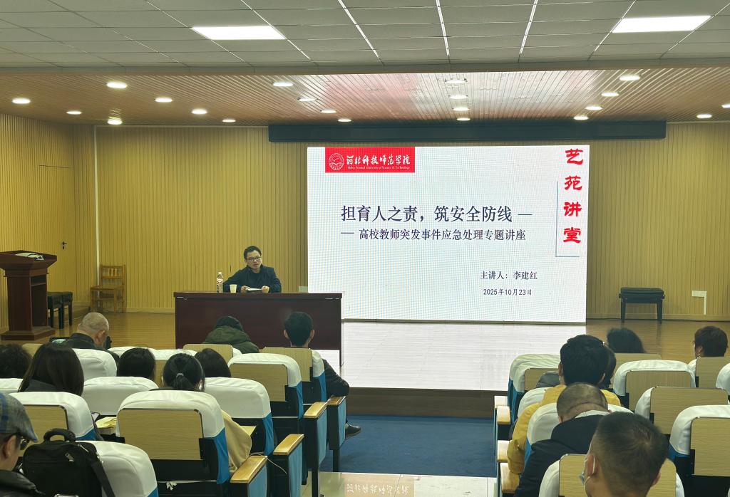 为进一步推进校园安全工作建设,增强教师应对学生突发事件应急处置能力,筑牢校园安全防线。2025年10月23日下午,艺术学院举办“艺苑讲堂”专题讲座,邀请校党委学工部副部长、学生处副处长李建红担任主讲嘉宾,开展了“担育人职责,筑安全防线”主题讲座,艺术学院全体教师聆听了本次讲座。