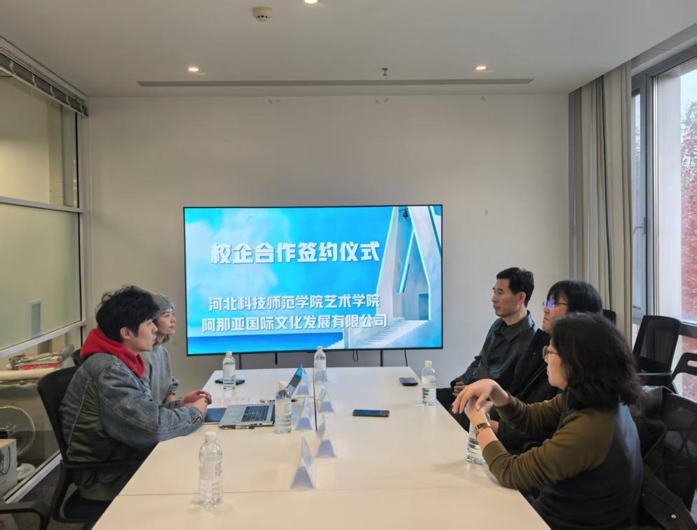 2025 年 10 月 31 日,河北科技师范学院艺术学院与阿那亚国际文化发展有限公司校企战略合作签约仪式顺利举行。艺术学院党委书记于海印、院长刘进成、副书记兼副院长孟颖、副院长郭晓希,及阿那亚国际文化发展有限公司副总经理周玉洁、人力行政负责人李秋南出席仪式。