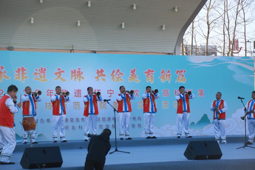 紧随其后的,是国家级非遗项目——抚宁鼓吹乐的精彩展演。当《柳青娘》的旋律响起,抚宁鼓吹乐团的传承人们手持唢呐、笙、锣等传统乐器登台。熟悉的民间曲调在乐手们的演绎下愈发悠扬婉转,时而俏皮活泼,时而庄重典雅,细腻的演奏技巧让在场师生惊叹不已。随后,原创鼓吹乐《百年秧歌情》惊艳亮相,这首由董连吉创作的曲目,将抚宁秧歌的欢快节奏与鼓吹乐的恢弘气势完美融合,既保留了传统韵味,又融入了时代元素,仿佛将观众带回了百年前抚宁民间热闹的秧歌盛会,展现出非遗文化与时俱进的生命力。