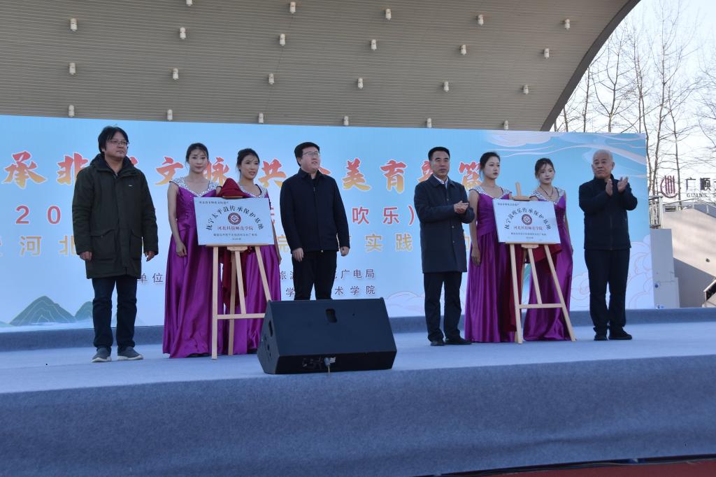 演出伊始,秦皇岛市旅游与文化广电局副局长刘彦广,河北科技师范学院党委常委、副校长刘荣昌,秦皇岛抚宁区人民政府副区长张广麒,河北科技师范学院艺术学院院长刘进成等领导,分别为国家级非遗项目—抚宁鼓吹乐传承保护基地和省级非遗项目—抚宁太平鼓传承保护基地揭牌。本次非遗项目传承保护基地的揭牌,标志着河北科技师范学院在专业建设上,深入推进校地合作、传统优秀文化传承创新方面迈出了坚实的步伐。